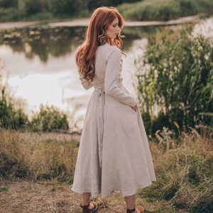 Embrace timeless style and comfort with our midi linen dress, designed for effortless elegance. Made from luxurious heavyweight linen, this dress offers a perfect balance of structure and flow. Featuring a flattering V-neck collar and a tie waist, it creates a beautiful, adjustable silhouette that suits any body shape. The midi length adds a classic touch, while the convenient side pockets make it as functional as it is stylish.