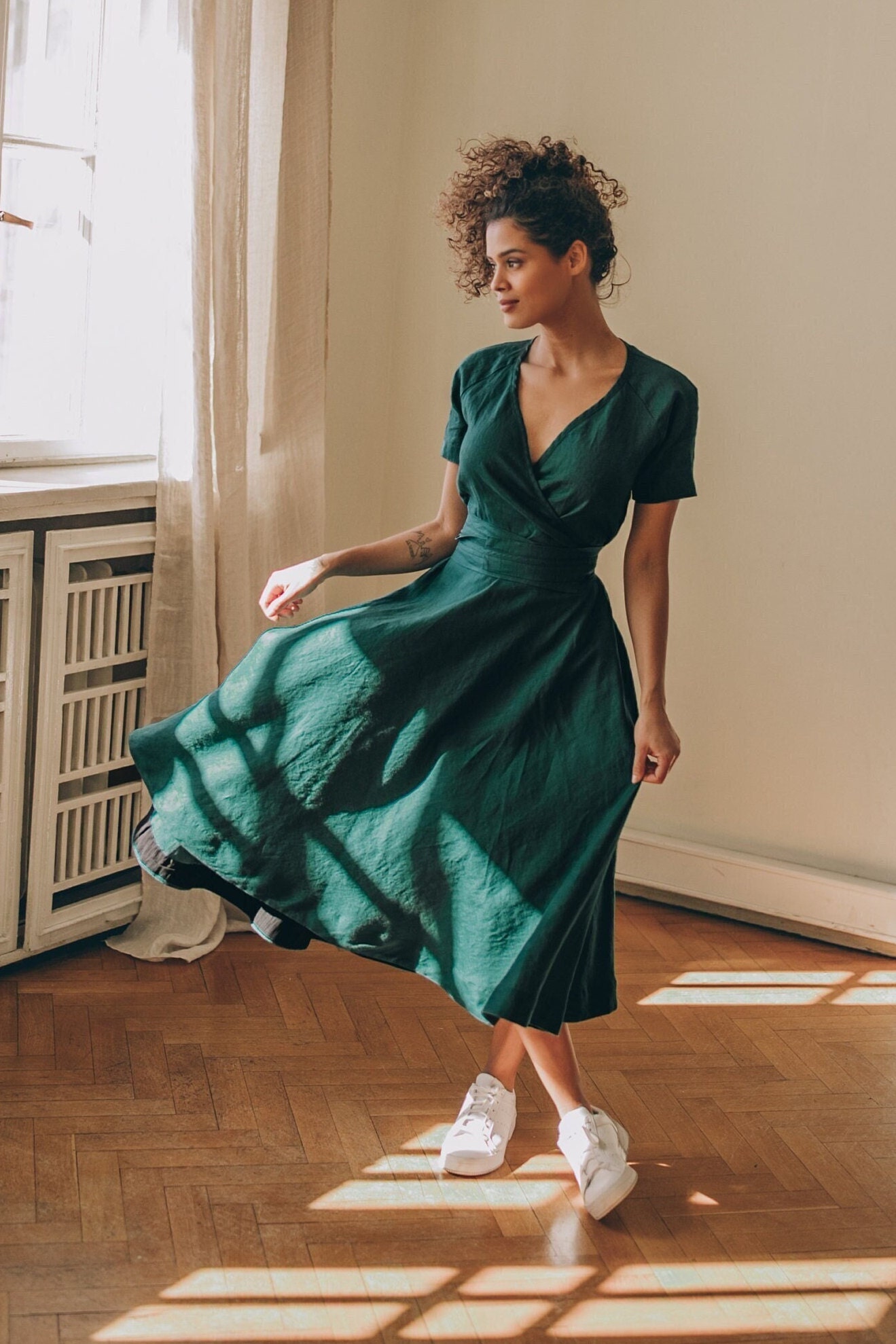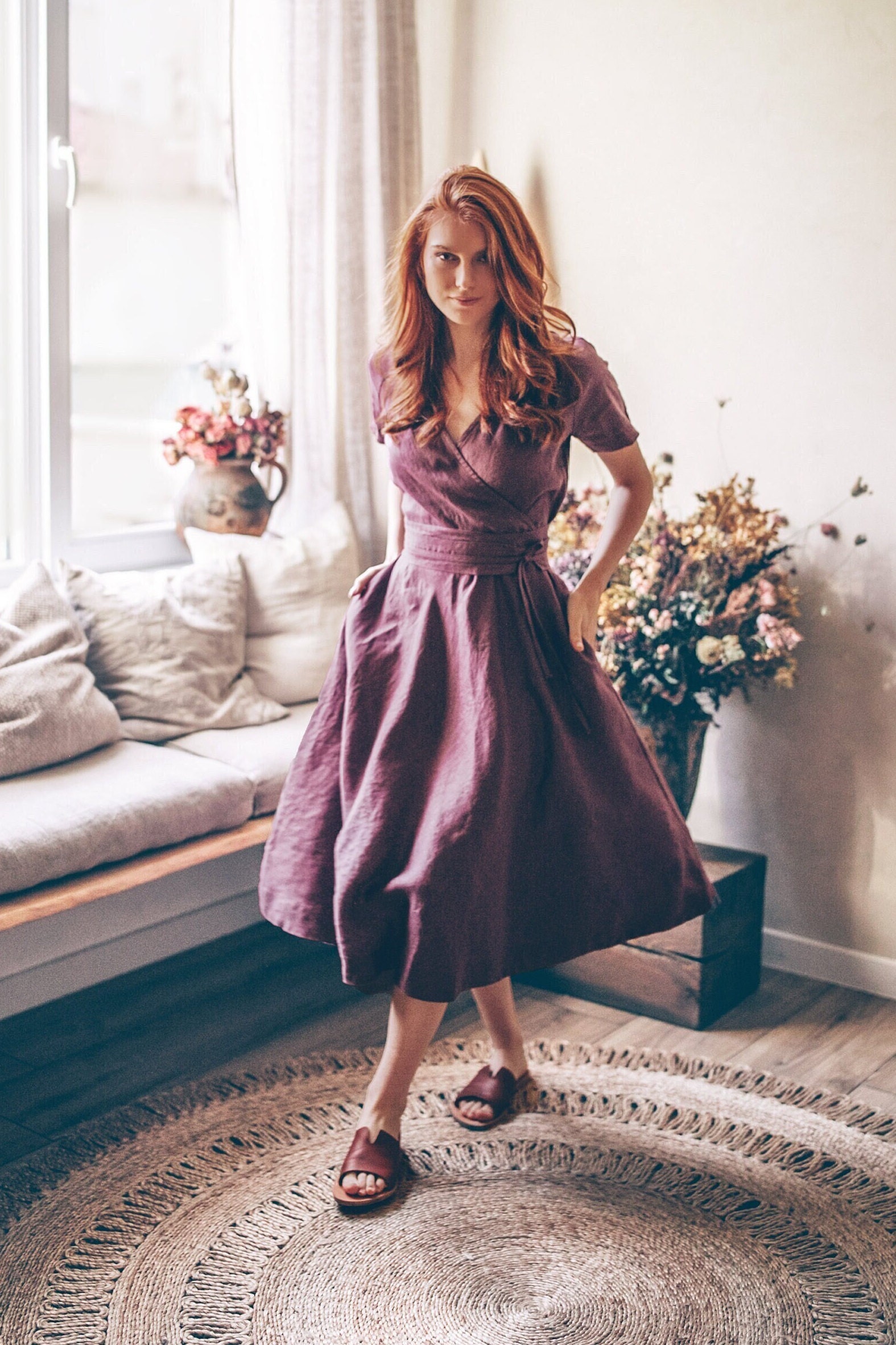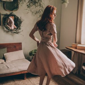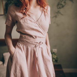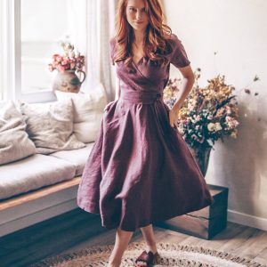 The stylish linen dress, with tie waist and pockets is all about the elegance and style. The essential summer green linen dress made from 100% high quality linen. This comfortable midi length dress has a surplice neckline, side pockets and a band that emphasizes the waist. Featured in a amethyst shade here, this delightful linen piece could be made in a variety of colors.
